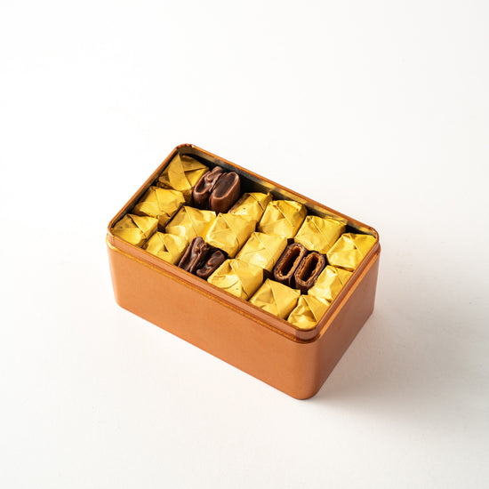 A premium selection of delicate crepe dentelle chocolates presented in an elegant gold box. Perfect for gifting.