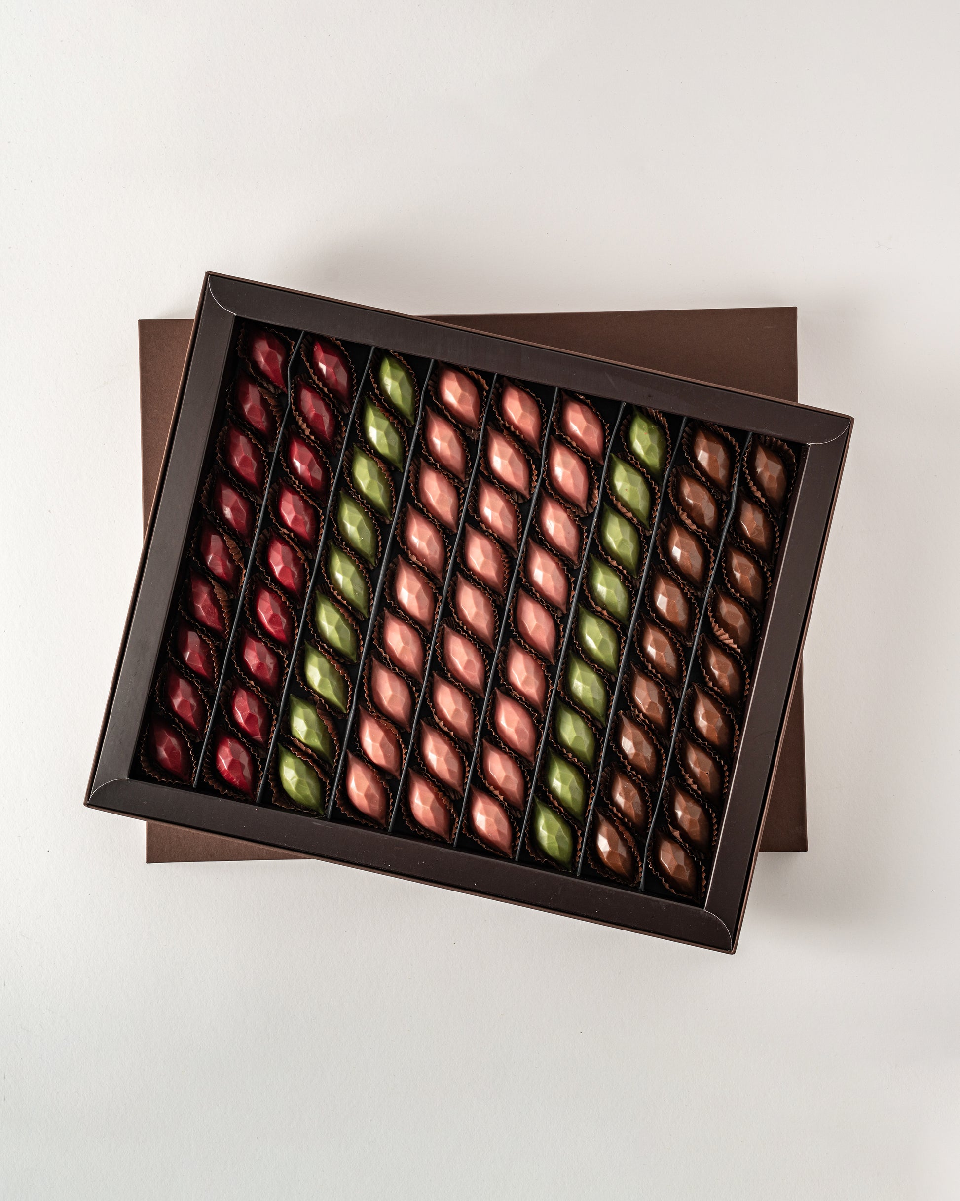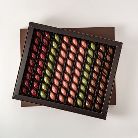 This 620-gram box features exquisite, unwrapped diamond-shaped chocolates in a variety of delightful flavors, including Pistachio, Cheesecake, Caramel Cake, and Caramel with Pecan. Perfect for those who appreciate elegance and taste, the unique shape and rich flavor combinations make this box a luxurious treat or a thoughtful gift.