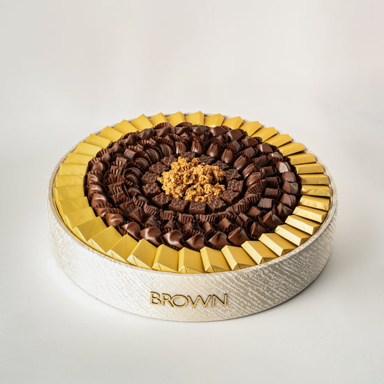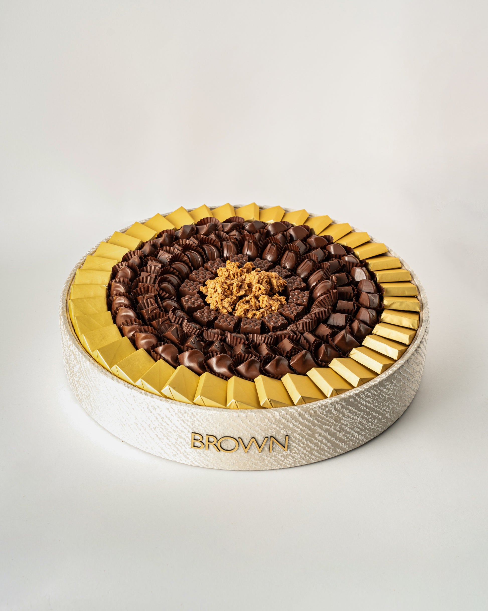 This 2.62 kg round fabric tray is filled with an assortment from our regular and classic chocolate collection. It features a variety of delicious chocolates, making it a perfect gift or treat for any occasion.