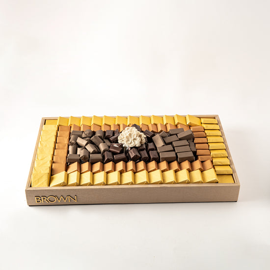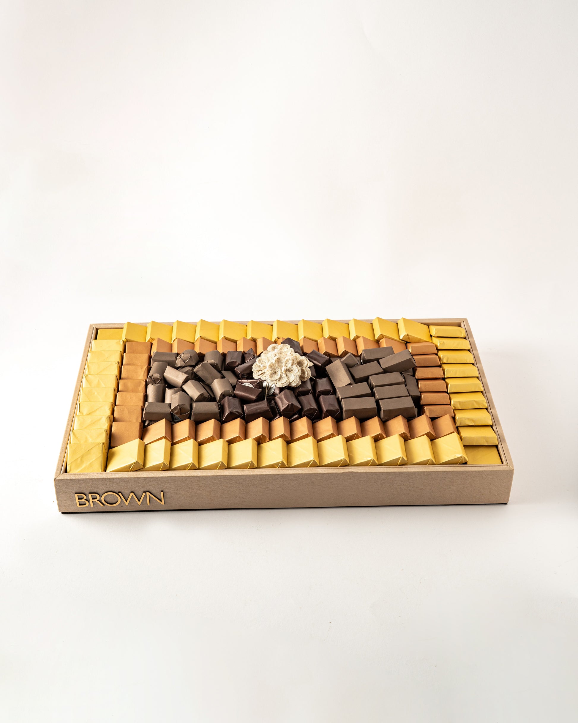 A stylish leather-wrapped rectangular tray filled with an elegant assortment of premium chocolates. Perfect for gifting or special occasions.
