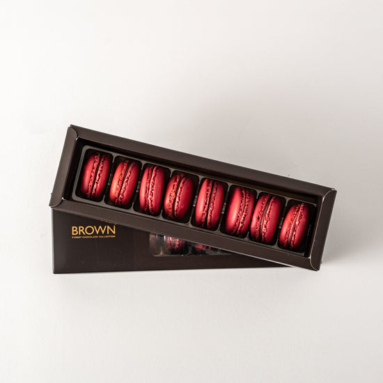 A box of 8 raspberry macarons, offering a sweet and tangy experience with every bite.