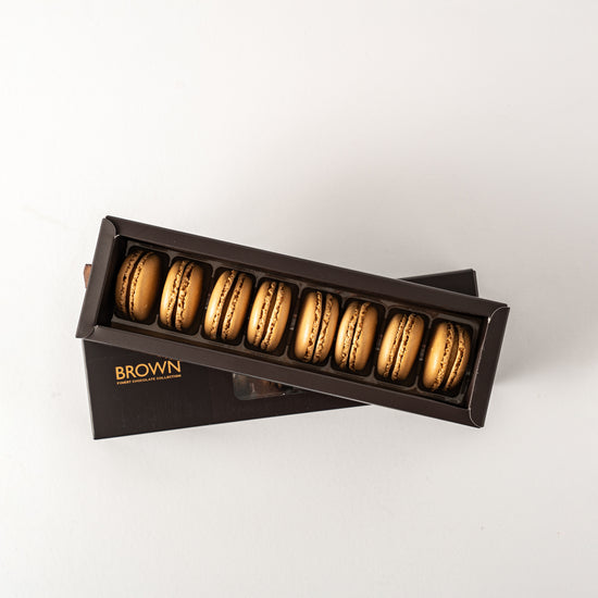 A box of 8 salted caramel macarons, blending sweet and salty for a perfect treat.