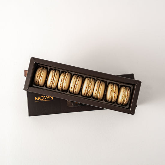 A box of 8 classic vanilla macarons, a timeless favorite for any occasion.