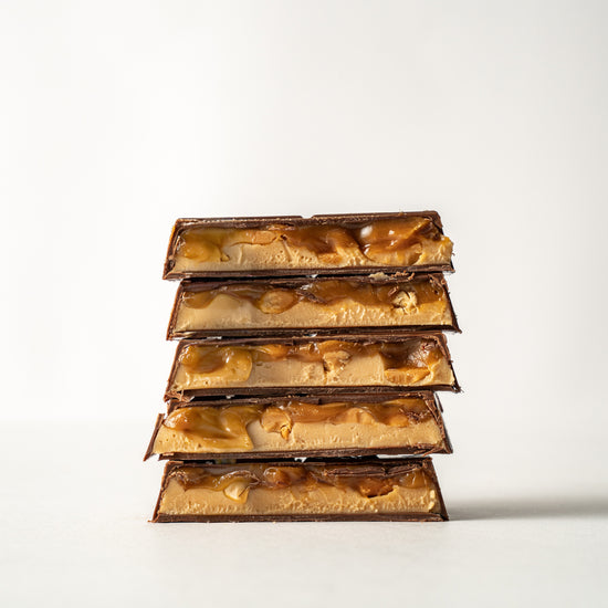 A rich bar filled with creamy peanut and soft caramel, coated in smooth chocolate for a satisfying bite.