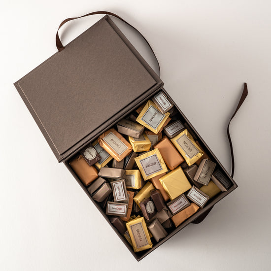 This elegant 1-kilogram box, adorned with a decorative ribbon, is filled with a selection of regular chocolates. Perfect for gifting or indulging, it combines sophisticated presentation with a delightful assortment of chocolates that are sure to please any recipient.